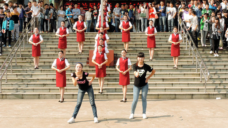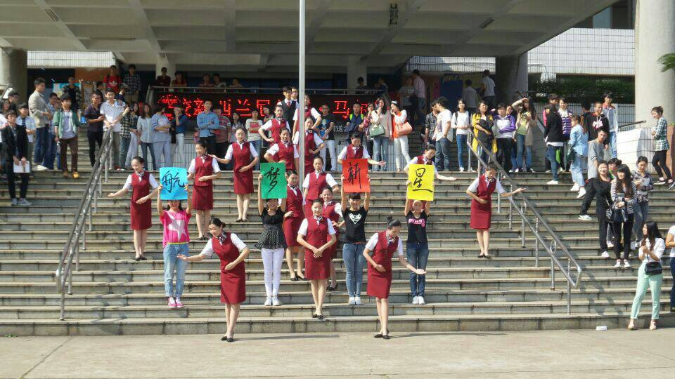 “快 閃”, 即“快閃行動”的簡稱,可視為一種短暫的行為藝術(shù),后期階段逐漸與品牌推廣、媒體影視相結(jié)合。鈴聲響起后,冷寂的空地上瞬間聚滿了人,忽然音樂響起,著裝 整齊的空乘女生優(yōu)雅的向第八教學(xué)樓走來,舉止從容大方,為大家展示空乘禮儀,隨后一名身穿嘻哈服的可愛女生在動感的音樂中跳起熱舞。伴隨著音樂和舞蹈,大 批同學(xué)前來圍觀。一曲過后,扎著馬尾的陽光女孩接著秀出另一種舞風(fēng)。短短幾分鐘青春熱情、活力四射的表演感染著現(xiàn)場的每一個人,許多同學(xué)還紛紛拿出手機(jī)拍 照。