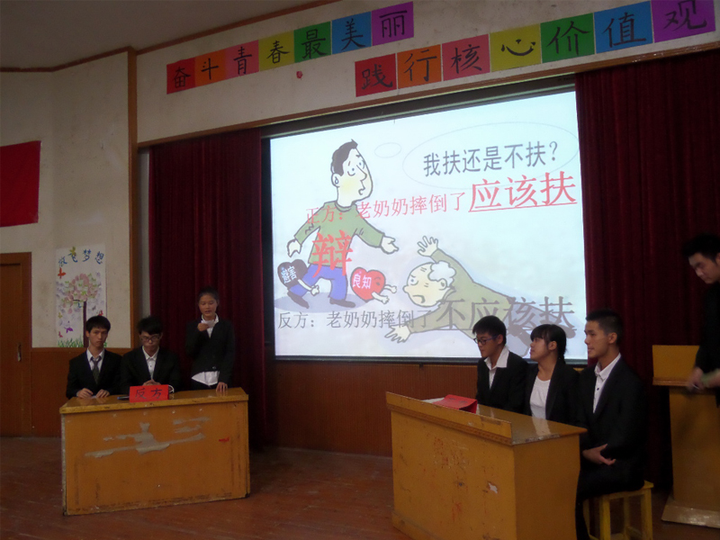 (http://v.youku.com/v_show/id_XODE5NzM0NDU2.html)在辯論賽中,辯手對(duì)于“老人摔倒扶還是不扶”展開(kāi)了唇槍舌戰(zhàn)。最后大家共同堅(jiān)定一個(gè)信念:每個(gè)人都有自己的見(jiàn)解,但中華美德不能丟,要樹(shù)立正確的價(jià)值觀。隨后小品“扶還是不扶”揭示了人的真善美,用善良的心去溫暖他人,堅(jiān)持正確的價(jià)值觀,世界會(huì)變得更加美好;1383022班陶?qǐng)蛲瑢W(xué)帶來(lái)《奮斗青春最美麗》,緊緊扣住團(tuán)會(huì)主題,每個(gè)人的青春都會(huì)由迷茫和彷徨,這樣的青春才是完整的,面對(duì)青春要挺起胸膛,肩負(fù)責(zé)任,堅(jiān)持不懈,不畏艱難。熱血澎湃的詩(shī)朗誦為我們理清了青春的迷茫,堅(jiān)定正確的核心價(jià)值觀;主持人針對(duì)科院核心價(jià)值觀對(duì)現(xiàn)場(chǎng)觀眾進(jìn)行提問(wèn),現(xiàn)場(chǎng)觀眾積極踴躍搶答,并正確回答科院核心價(jià)值觀:"勇于擔(dān)當(dāng),止于至善"。