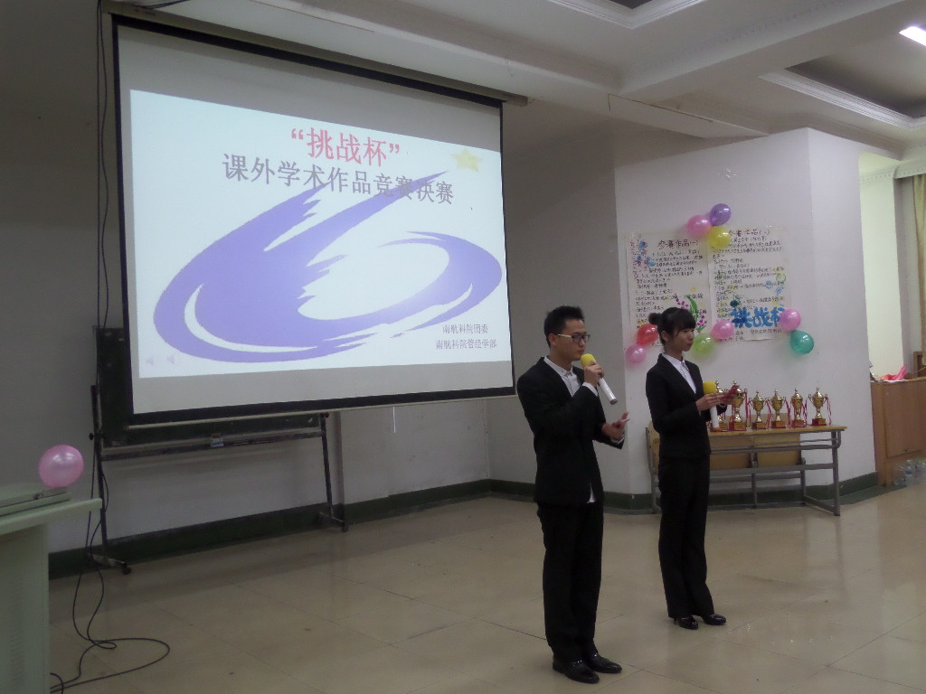 南昌航空大學(xué)科技學(xué)院“挑戰(zhàn)杯”課外學(xué)術(shù)作品競賽(以下簡稱“挑戰(zhàn)杯”)自開展以來,得到我院領(lǐng)導(dǎo)的高度重視和各相關(guān)部門的大力支持。3月27日15:00,由科技學(xué)院團(tuán)委主辦、管理與經(jīng)濟(jì)學(xué)部承辦的2015年南昌航空大學(xué)科技學(xué)院“挑戰(zhàn)杯”決賽在10107教室順利落下帷幕。參與和出席決賽的評委與嘉賓有:黨委副書記、副院長江天光,副院長謝友寶、管理與經(jīng)濟(jì)學(xué)部主任蔡江川、科技園總經(jīng)理羅來松、教學(xué)與科研辦公室主任萬衛(wèi)強(qiáng)、學(xué)生工作辦公室主任魏海悟、團(tuán)委書記王軍成,各學(xué)部黨、團(tuán)總支書記、管理與經(jīng)濟(jì)學(xué)部全體教職工、各參賽作品指導(dǎo)老師,以及各學(xué)部學(xué)生組織主席團(tuán)代表。