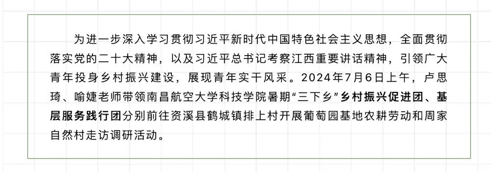7月10日,《資溪團(tuán)縣委》報(bào)道了我院暑期“三下鄉(xiāng)”鄉(xiāng)村振興促進(jìn)團(tuán)、基層服務(wù)踐行團(tuán)分別前往資溪縣鶴城鎮(zhèn)排上村開(kāi)展葡萄園基地農(nóng)耕勞動(dòng)和周家自然村走訪調(diào)研活動(dòng)的消息。