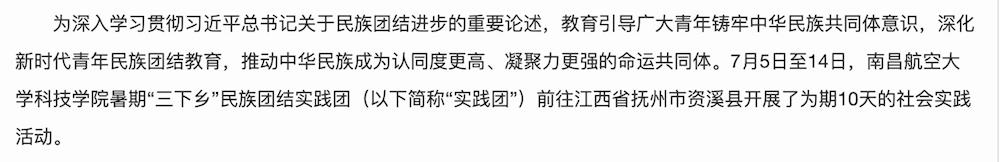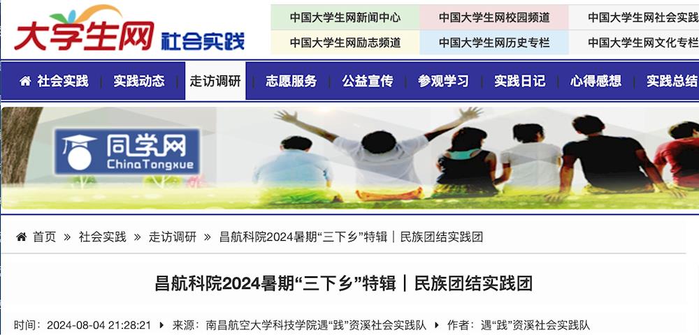 《大學(xué)生網(wǎng)》:昌航科院2024暑期“三下鄉(xiāng)”特輯|民族團結(jié)實踐團 作者: 來源: 發(fā)布時間:2024-08-06 10:01:00 瀏覽次數(shù): 次 【字號:小 大】 8月4日,《大學(xué)生網(wǎng)》報道了我院暑期“三下鄉(xiāng)”民族團結(jié)實踐團前往江西省撫州市資溪縣開展了為期10天的社會實踐活動的消息。 媒體鏈接:https://www.universitychina.net/shijian/diaoyan/20240804/155992.html 【打印正文】