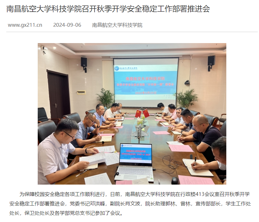 《高校之窗》:南昌航空大學科技學院召開秋季開學安全穩(wěn)定工作部署推進會 作者: 來源: 發(fā)布時間:2024-09-06 15:03:12 瀏覽次數(shù): 次 【字號:小 大】 9月6日,《高校之窗》報道了我院召開秋季開學安全穩(wěn)定工作部署推進會的消息。 媒體鏈接:https://www.gx211.cn/news/20240906/n17255937221626.html 【打印正文】