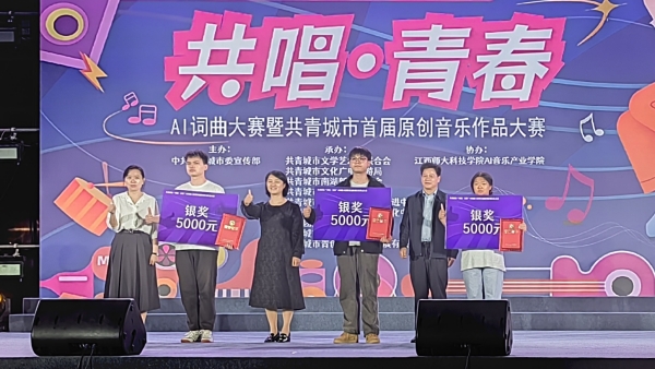 近日,共青城市“共唱·青春” Ai詞曲大賽暨共青城市首屆原創(chuàng)音樂(lè)作品大賽公布獲獎(jiǎng)名單,我院學(xué)子積極參與,取得優(yōu)異成績(jī)。其中由電子信息與自動(dòng)化學(xué)部2021級(jí)自動(dòng)化專業(yè)胡永紅同學(xué)創(chuàng)作的作品《青春共青城》獲得銀獎(jiǎng),由文學(xué)與體育學(xué)部2022級(jí)英語(yǔ)專業(yè)丁榮勛、經(jīng)濟(jì)管理學(xué)部2022級(jí)電子商務(wù)專業(yè)楊沛琪、航空服務(wù)與傳媒學(xué)部2022級(jí)新聞專業(yè)余盧萍和2022級(jí)廣播電視編導(dǎo)張洪軒學(xué)生團(tuán)隊(duì)完成的作品《美美與共 青春有你》獲得優(yōu)秀獎(jiǎng)。